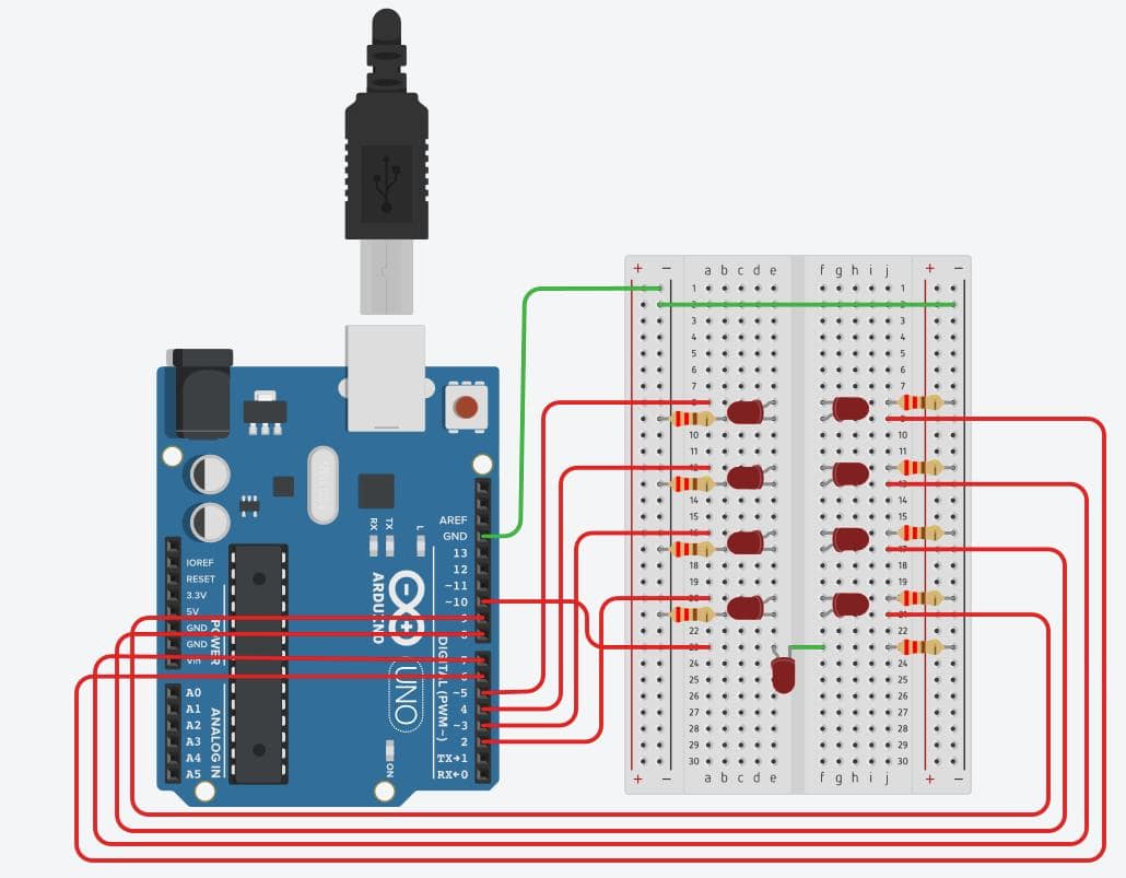 I created 9 LEDs and light them and watch them rotate around. I used pins 2 to 10. Bottom LED is 10. On the left from bottom to top 2 to 5. On the right, top to bottom 6 to 9. Green wires are grounds. Red wires go the the LED pins.