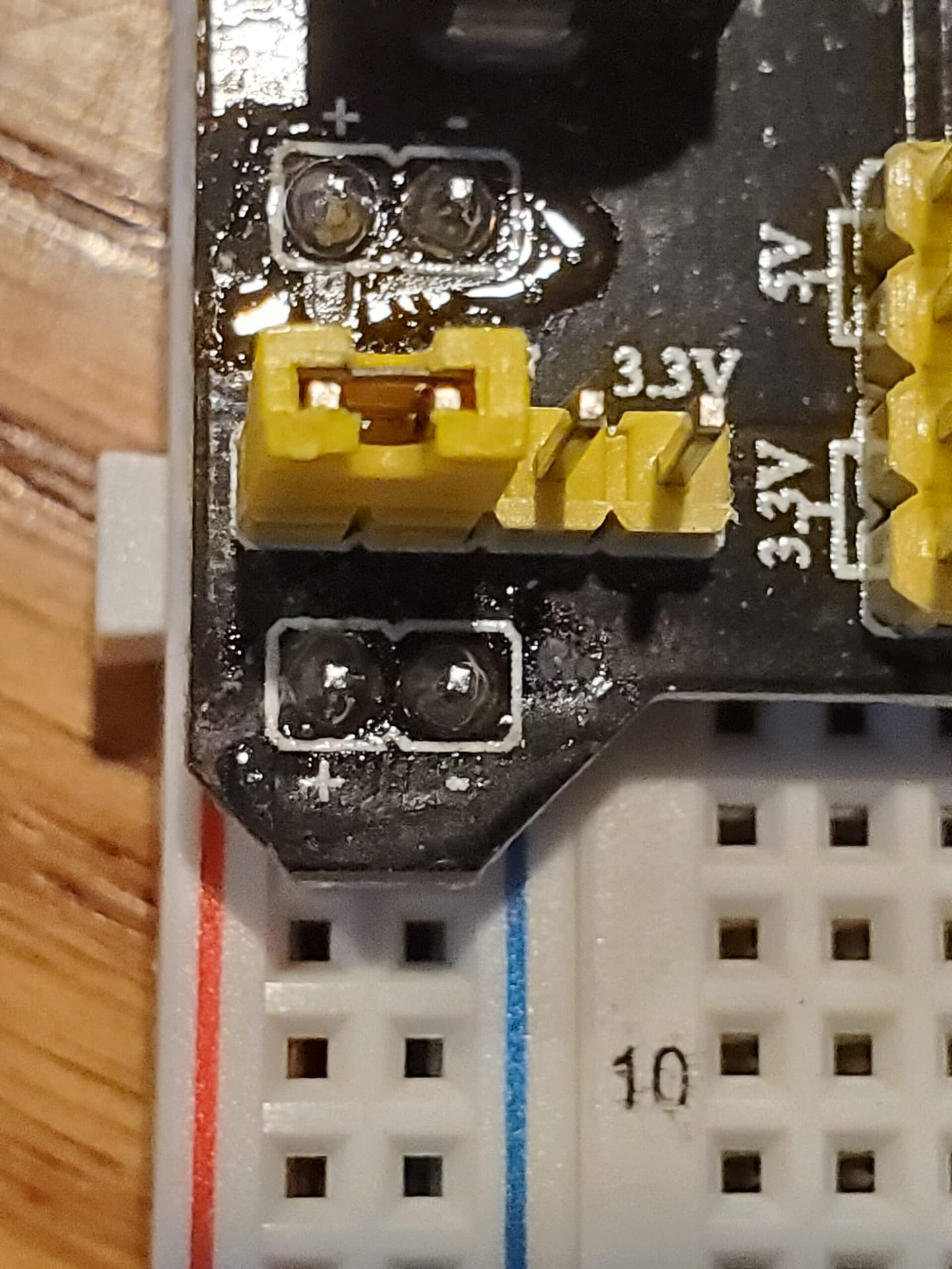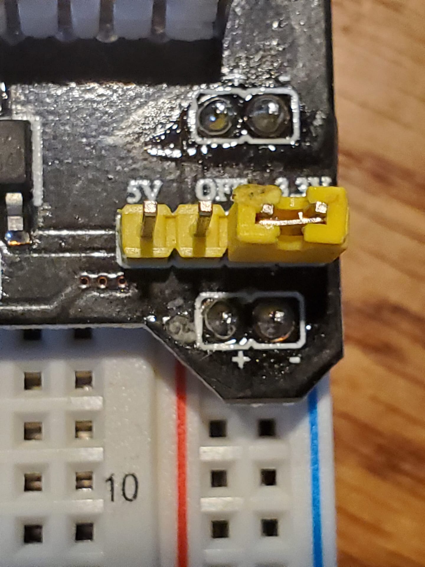 On each side of the power module. you have + and – to match up the breadboard. As you can see they match up with the red (+) and blue (-). I set the left side to 5V and right side to 3.3V to match up to the 9V power supply.