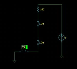 This is an example of a circuit with an AND Gate. Both switches are in series. So when both our 1 or On, V1 goes to 5V. If both or one are off, no voltage reaches V1 because the circuit is open.