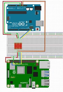 This could go in both Arduino and Raspberry Pi sections. I have a SparkFun Logic Level Converter – Bi-Directional (LLC-BD) module. The red device in the middle. On one side is LV (Low Voltage) and the other side is HV (High Voltage). Low Voltage is the 3.3V Raspberry Pi and the High Voltage is the 5V Arduino UNO. Grounds are connected across along with each pins 1,2,3,4. So LV1 goes to HV1. This device is I2C capable. The Arduino has both 3.3V and 5V connected to the LLC-BD.