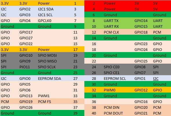 I created this chart for the pinout of the Raspberry Pi. Center columns are the physical pin numbers. First and last columns are the type of pin. You see I2C pins 3,5 (I2C-1) for I2C bus between devices and 27,28 (I2C-0) for a HAT. You see orange and red pins for 3.3V and 5V. Light orange pins are standard GPIO pins. Dark gray are SPI pins. Light Green are UART pins. You have many ground pins. On my T-Cobbler Pro, you have a header pin that connects to the power/ground on the outer rails of the bread board. PCM (Pulse-code Modulation) is a digital representation of sampled analog. On the Raspberry Pi it’s a form of digital audio output which can be understood by a DAC for high quality sound. Most sites recommend you use the GPIO pins for projects so in the future you have the multipurpose pins like UART available. You see in my I2C pages I use I2C-1 pins 3 (GPIO2) and 5 (GPIO3)